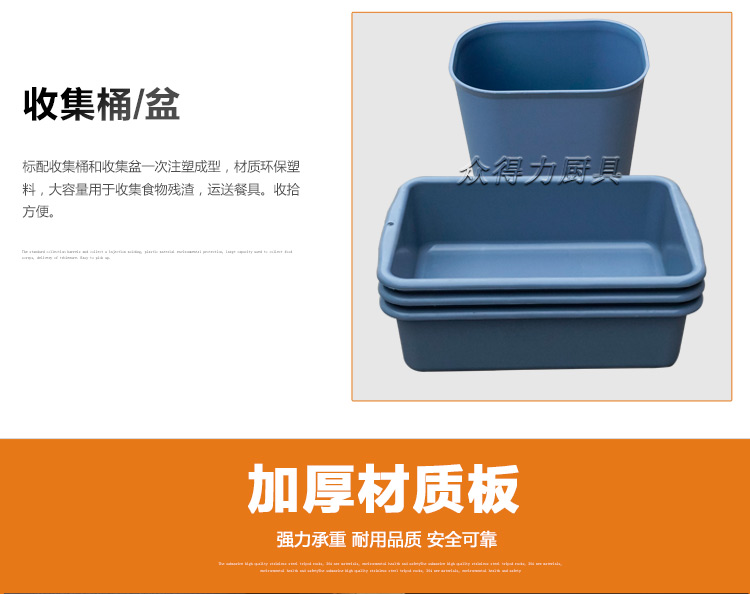 江西眾得力廚具有限公司生產銷售商用廚具,白鋼調理系列設備及食品機械,提供中央廚房工程項目整體解決方案。不銹鋼收集車有方管和圓管之分,組裝式,拆卸清洗方便,采用標配足0.8mm201無磁不銹鋼加工設計。外形美觀,設計精量,符合餐飲食品衛生需求。