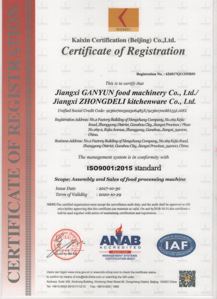 江西眾得力廚具有限公司順利通過ISO9001質(zhì)量管理體系認(rèn)證【中文版、英文版】